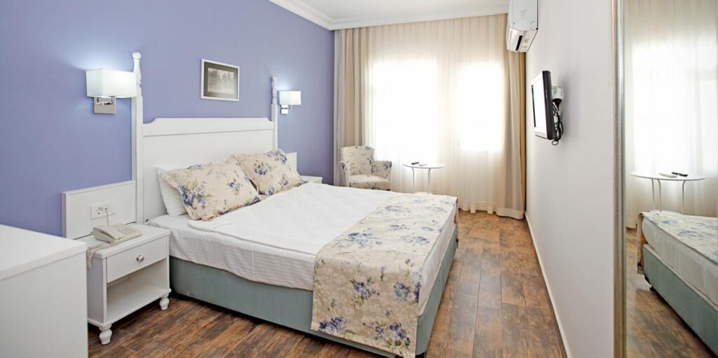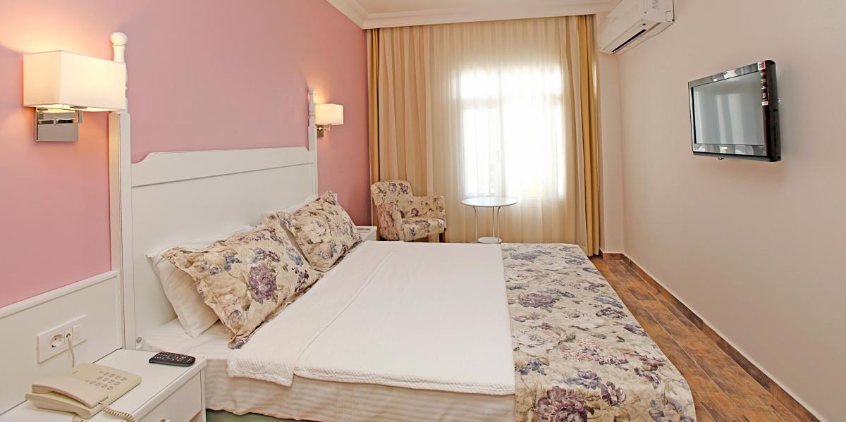 There are double bed and bathroom available. Additional bed or a baby bed can be added as per order. 2+1 persons can accommodate. It has garden and/or pool, sea view.
